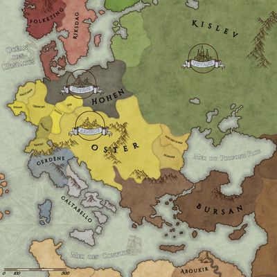 En l'an 300, Oldmont est dominé par trois empires : Kislev, Oster et Hohen. Ces trois factions se sont érigées au rang d'Empire depuis plusieurs siècles et ont régné par les victoires militaires. Les trois dirigeants contemporains de ces Empires, la Tsarine Katarina, le Saint-Empereur François II et la Reine Louise de Hohenburg dirigent dans une confiance absolue leurs états. Pour autant, la stabilité sur le continent apportée par le rapport de force entre ces trois puissances rend les opportunités militaires moins nombreuses, et met en évidence l'incapacité de ces dirigeants à gouverner en temps de paix.<br> | En l'an 300, Oldmont est dominé par trois empires : Kislev, Oster et Hohen. Ces trois factions se sont érigées au rang d'Empire depuis plusieurs siècles et ont régné par les victoires militaires. Les trois dirigeants contemporains de ces Empires, la Tsarine Katarina, le Saint-Empereur François II et la Reine Louise de Hohenburg dirigent dans une confiance absolue leurs états. Pour autant, la stabilité sur le continent apportée par le rapport de force entre ces trois puissances rend les opportunités militaires moins nombreuses, et met en évidence l'incapacité de ces dirigeants à gouverner en temps de paix.<br> | ||