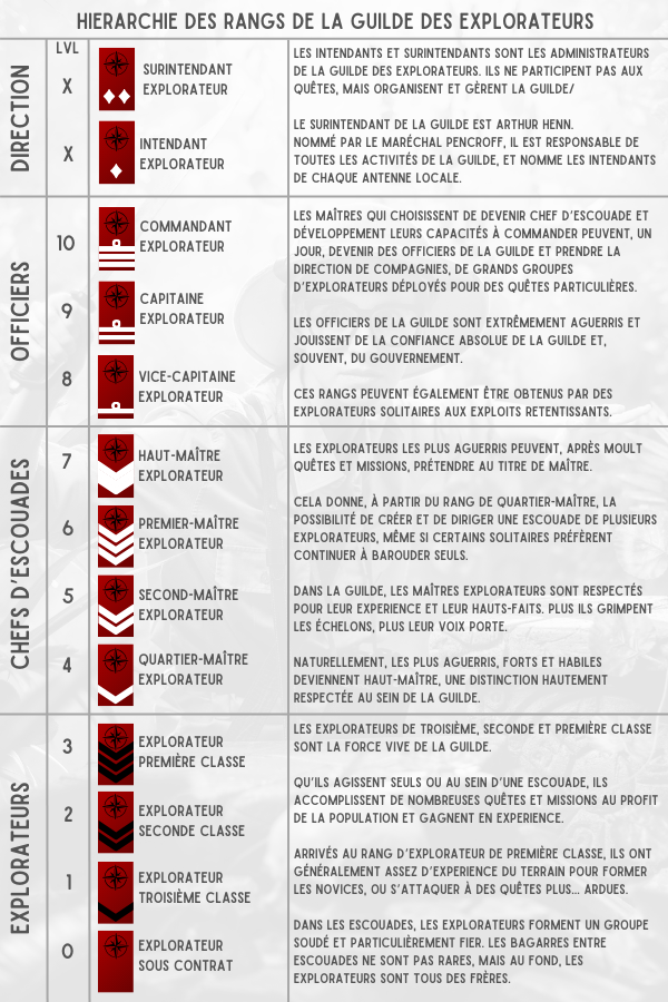 Les rangs de la guilde marquent la progression de l'explorateur parmi ses pairs et lui permet d'accéder à des avantages en fonction de son rang.