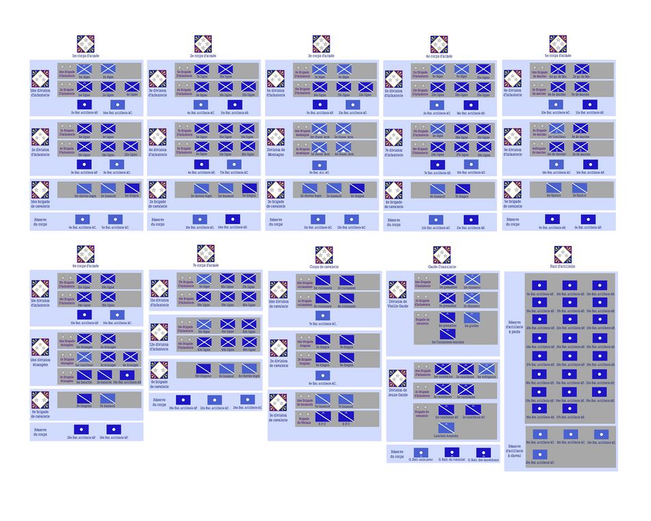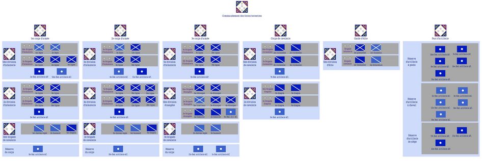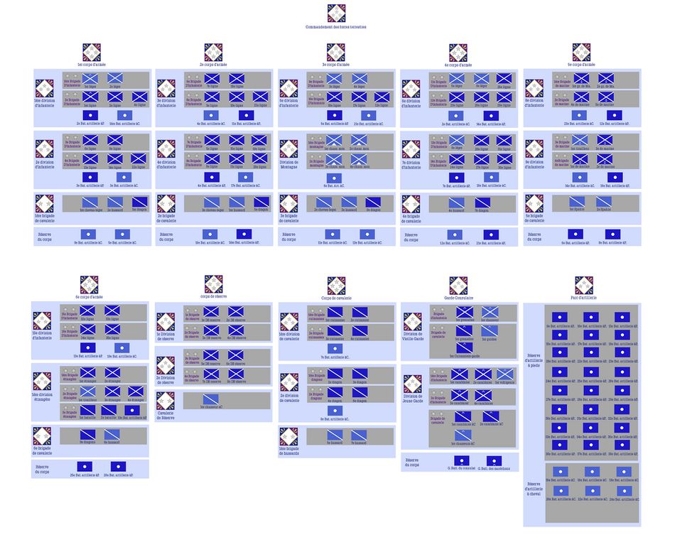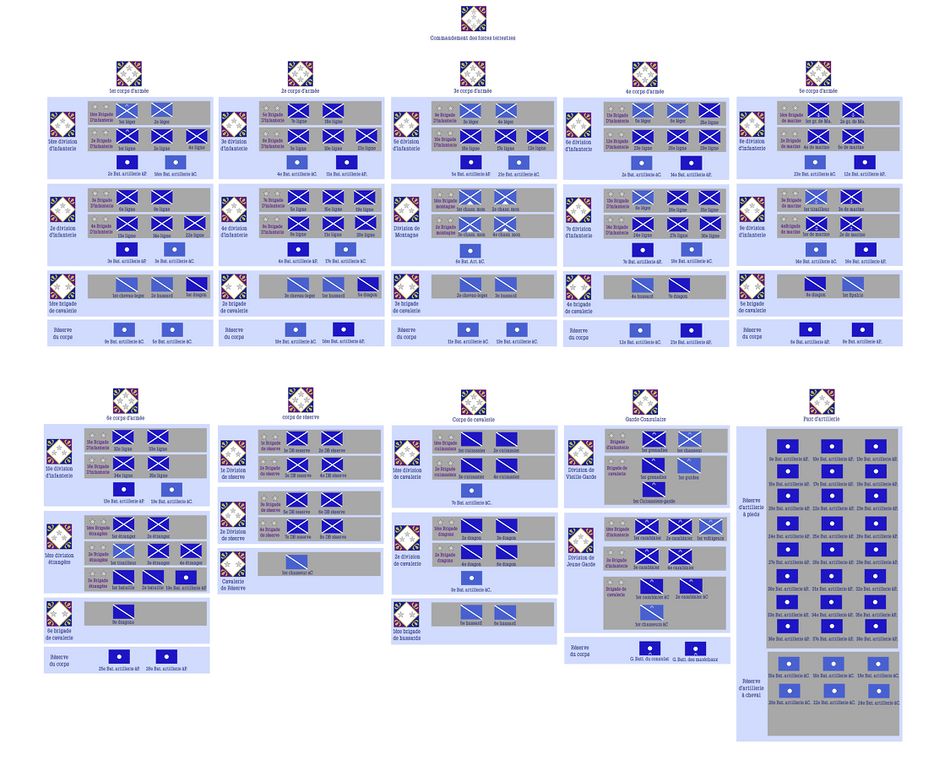 Les ordres de batailles regroupent et organisent toutes les unités combattantes de la Garde à un moment donné. Ces organigrammes donnent donc une idée des capacités opérationnelles de la garde à un moment donné, au gré des réformes et des montées en puissance qui ont jalonné son évolution. Cette age a pour objectif de contextualiser certains récits de batailles en donnant une vision claire des forces en disponibles à ce moment.