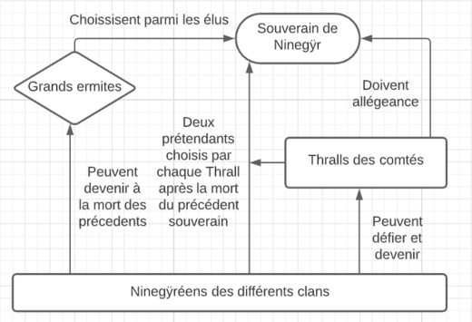 Il semble que Ninegÿr ait depuis toujours adopté le système de "monarchie élective", c'est-à-dire qu'un souverain, le roi, y est élu par vote, et non du fait héréditaire comme dans les monarchies communes. Pour être plus précis, à la mort du roi ou de la reine, les chefs des clans de Nynegÿr, les Thralls, se doivent tous de proposer deux membres de leur comté pour succéder au défunt souverain. Chaque Thrall doit donc retenir deux prétendants dans son comté. En théorie, c'est un système égalitaire puisque tous les ningÿréens sont éligibles, mais dans les faits, il est souvent suggéré d'avoir accompli un haut-fait pour se présenter à cette sélection. Les grands ermites ont ensuite la tâche de juger chaque prétendant et déterminer lequel sera roi ou reine. Le nouveau souverain se doit d'élire son compagnon parmi les prétendants déjà proposés par les Thralls ; il n’a cependant pas le droit de choisir le prétendant venant du même comté que lui ou elle. Si le système de monarchie élective met, en théorie, toute personne sur le même pied d'égalité, bon nombre de Thralls ont, au cours de l'histoire, préféré proposer leurs descendants au détriment des autres habitants de leur comté. La résidence royale est appelée Dean Rold.