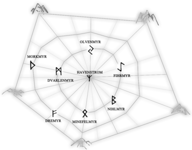 Les huit domaines faits, le grand artisan contempla son œuvre et remarqua qu’il y manquait quelque chose, la vie. En premier lieu il créa les nains en mâchant et en recrachant des galets au sein du monde rocheux de Dvarlenmyr ; des tas de paille minuscules qu’il avait assemblé à Olvenmyr naquirent les olves (ou elfes en langage commun) tandis qu’il fit sortir des fissures rocheuses et vaseuses de Morkmyr toutes sortes de créatures monstrueuses. Finalement, il choisit de sacrifier l’un de ses yeux qu’il envoya sur Nilhmyr, d’où naquirent les Opnagons, des êtres possédant une toute petite partie du pouvoir du Créateur. Il les dota tous d’une aptitude à l’évolution et dans le fabuleux processus de création qu’était son œuvre, il vint à en perdre une de ses mains. En décidant de sacrifier sa dernière main, l’artisan créa les Heydroms à partir de ses cinq doigts restants. Ces êtres, directement liés à leur créateur de par leur conception, possédaient également une partie de ses pouvoirs. Ils furent déposés à Havenstrom, le monde le plus au centre de toute la toile d’où l'on pouvait accéder à l’intégralité de l'œuvre de l’Artisan. Au contraire des autres, ce n’était pas un monde issu de matériaux bruts ou grossiers, mais bien un monde créé avec pour base un métal introuvable ailleurs : l’orichalque. Le domaine, ou plutôt, les mondes étaient créés mais, sans mains, le premier des artisans ne pourrait dès lors plus que regarder sa création évoluer par elle-même. Maintenant spectateur de la scène de théâtre qu’il avait engendré, le Grand Charpentier sans mains et au regard flamboyant se mit à déambuler au sein de sa toile, naviguant entre les différents mondes, les examinant et les surveillant tour à tour de son regard de feu. Ainsi était né ce que les ninegÿréens appeleraient aussi “le Soleil”.